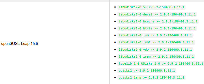 Running udisksctl dump will include the version number for udisks2: 2.9.2, which reveals a vulnerability that affects a few operating systems. To confirm if the operating system of the box is vulnerable, I read /etc/os-release: openSUSE Leap 15.6, which is a listed vulnerable target for udisks2 versions >= 2.9.2: