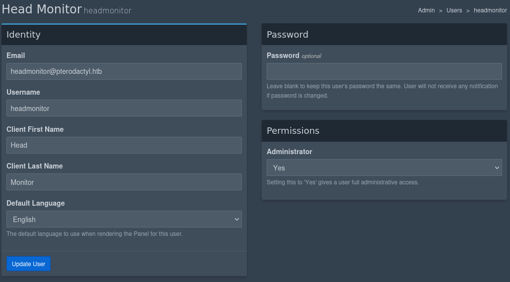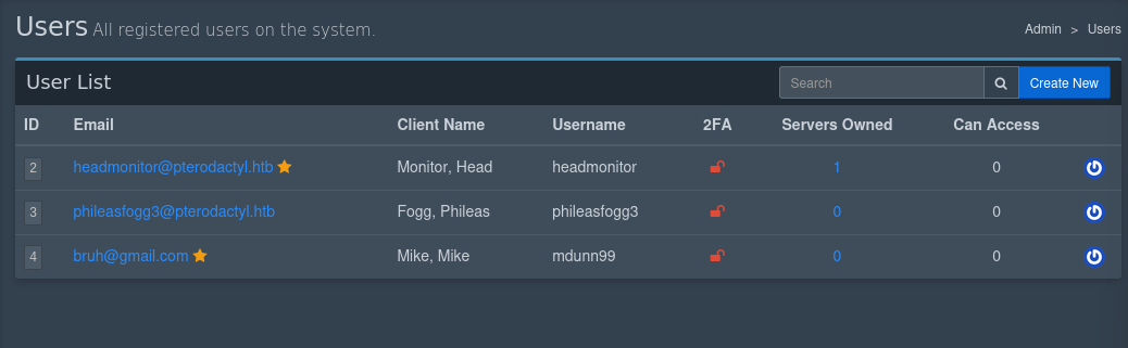 So, I’ll try logging into the pterodactyl panel with my new credentials (mdunn99:password). We have direct access to the other users we saw earlier in the database and can change their passwords:
