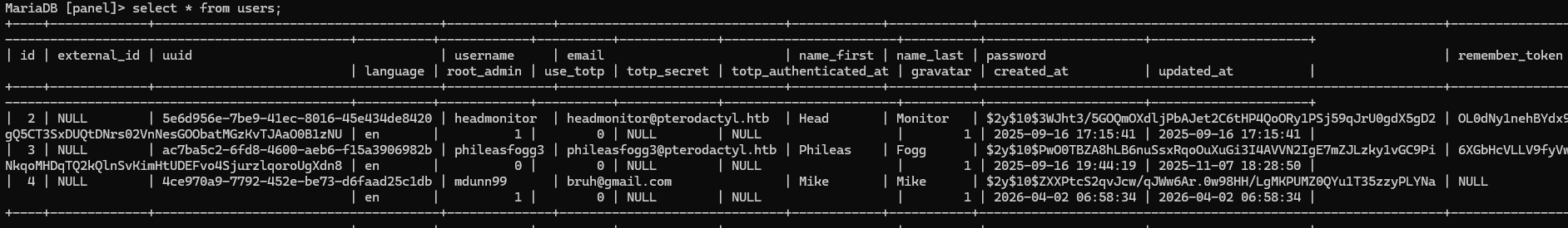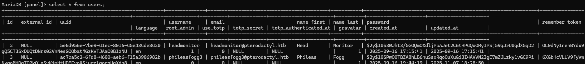 We can connect by using mysql on the box: mysql -u pterodactyl -pPteraPanel, but: