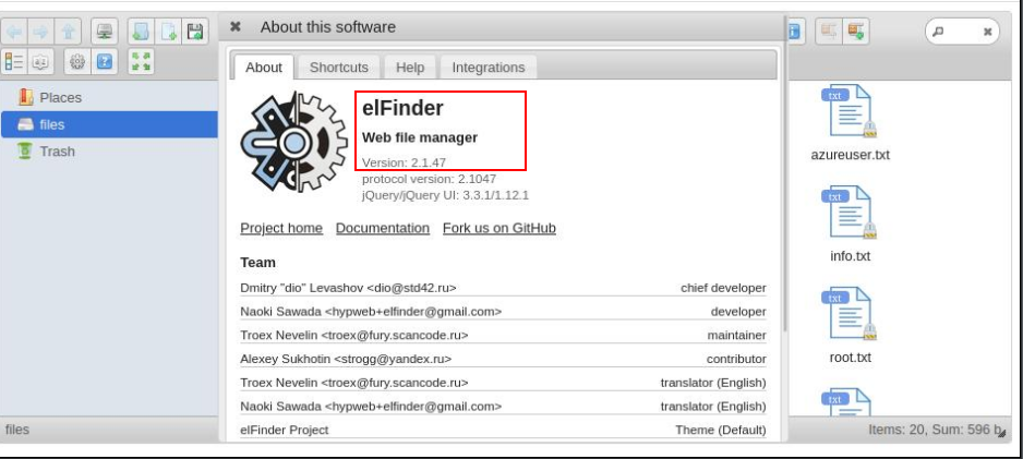 With a quick Google search, I found that this web server, elFinder v2.1.47 is vulnerable to CVE-2019-9194. CVE-2019-9194 is available as a default Metasploit module as exploit/unix/webapp/elfinder_php_connector_exiftran_cmd_injection.